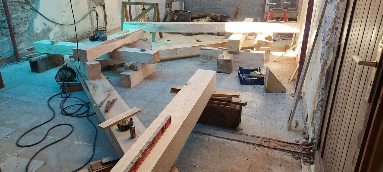 - Conception / taille et pose dune charpente traditionnelle avec pannes intermédiaires et faîtage composée d'une ferme centrale sur blochets avec jambes de force et de deux fermes de pignons en remplacement d'une ancienne charpente à fermettes abimée.