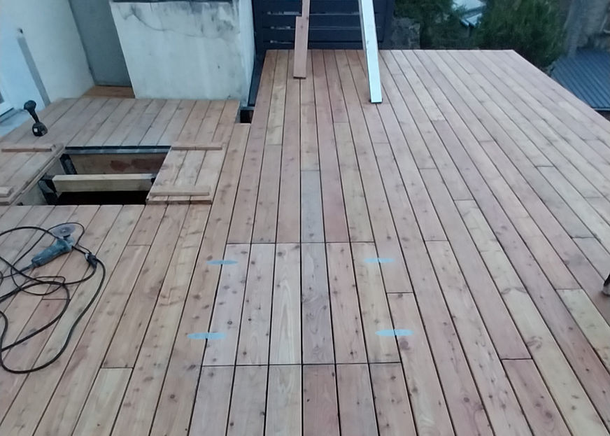 Conception / fabrication et pose d'une terrasse sur poteaux et poutrelle béton recouvrant un ancien balcon avec une trappe d'accès pour le jardin et une vers un espace rangement sur l'ancien balcon